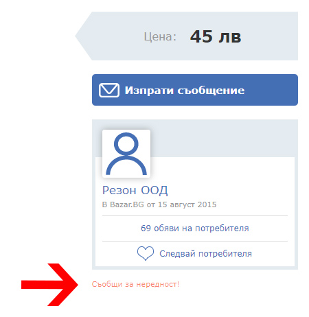 1. Линк за съобщаване на нередност. Във всяка обява се съдържа линк за съобщаване на нередност. Кликнете го и преминете към стъпка №2.