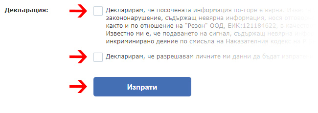 8. Изпращане. Преди да натиснете бутона Изпрати, задължително декларирайте, че сте запознат със своите права и отговорности.